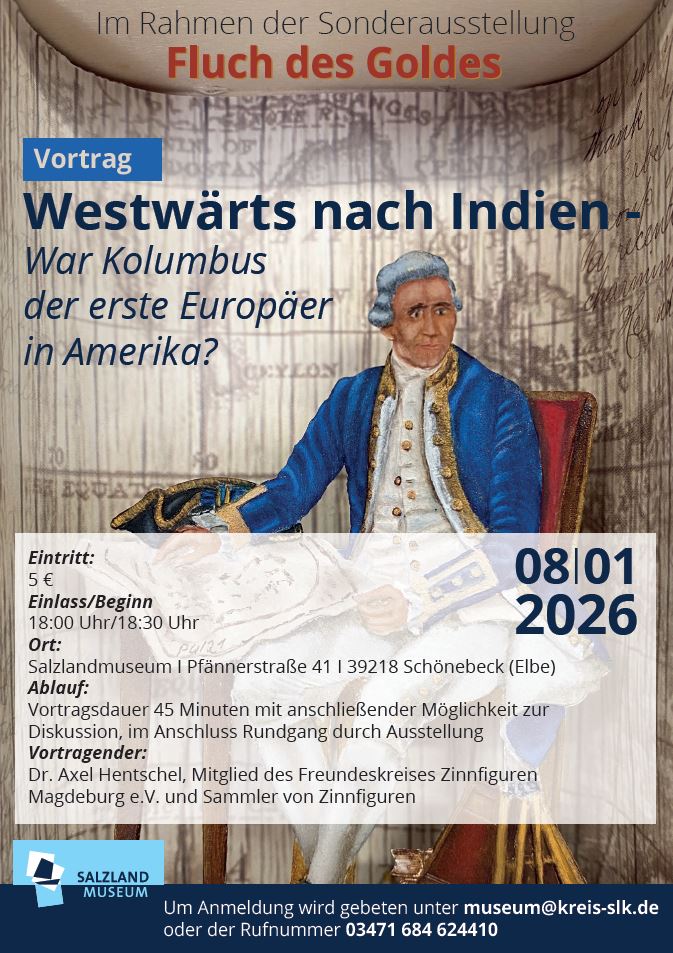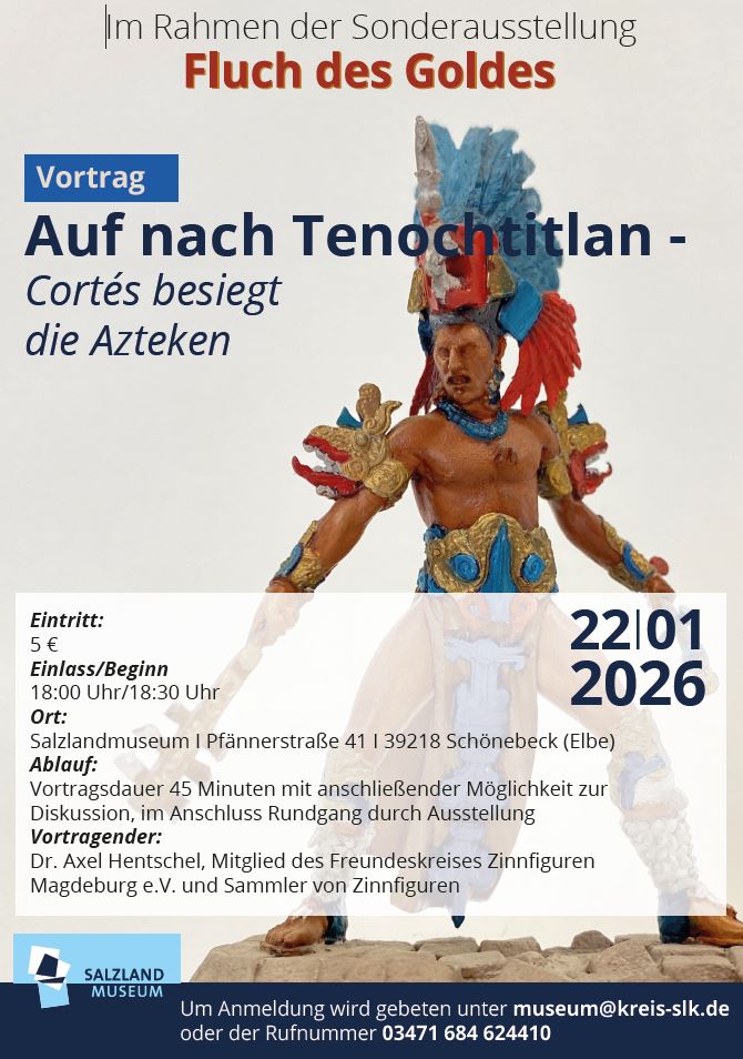 Das Salzlandmuseum wird in seiner neuen Sonderausstellung „Fluch des Goldes - Zinnfiguren erzählen die Geschichte Amerikas“ mehr als 6.000 Zinnfiguren des Freundeskreis Zinnfiguren Magdeburg e.V. sowie befreundeter Sammler präsentieren. Zahlreiche Szenen historischer Ereignisse und berühmter Kultstätten verdeutlichen, wie die Suche nach neuem Land, größeren Reichtümern und vor allem Gold zur Zerstörung und zum Untergang der indianischen Kulturen führte.